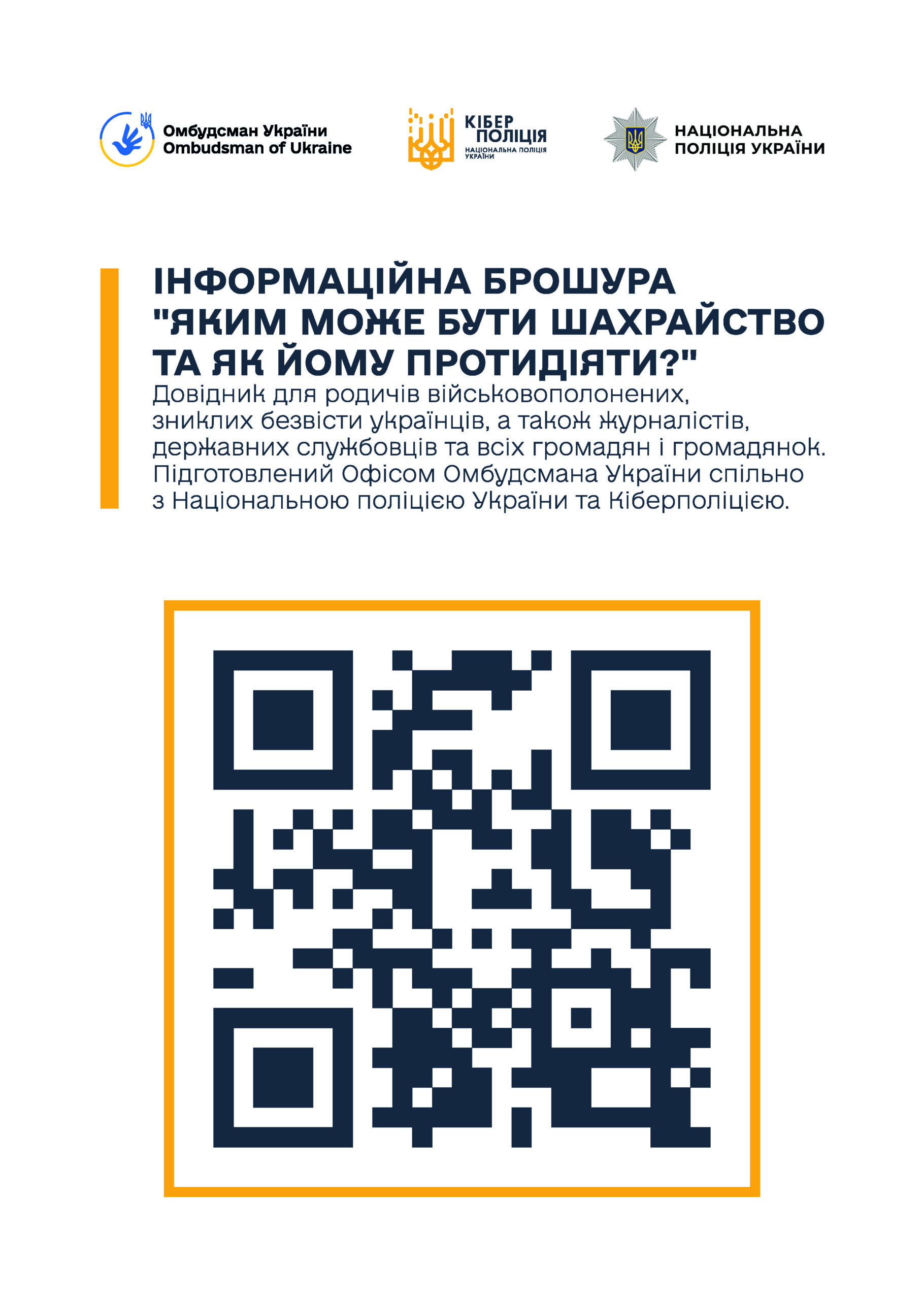 Переглянути та завантажити брошуру можна за посиланням або відсканувавши QR-код: https://www.ombudsman.gov.ua/storage/app/media/uploaded-files/yakim-mozhe-buti-shakhraistvo-veb.pdf