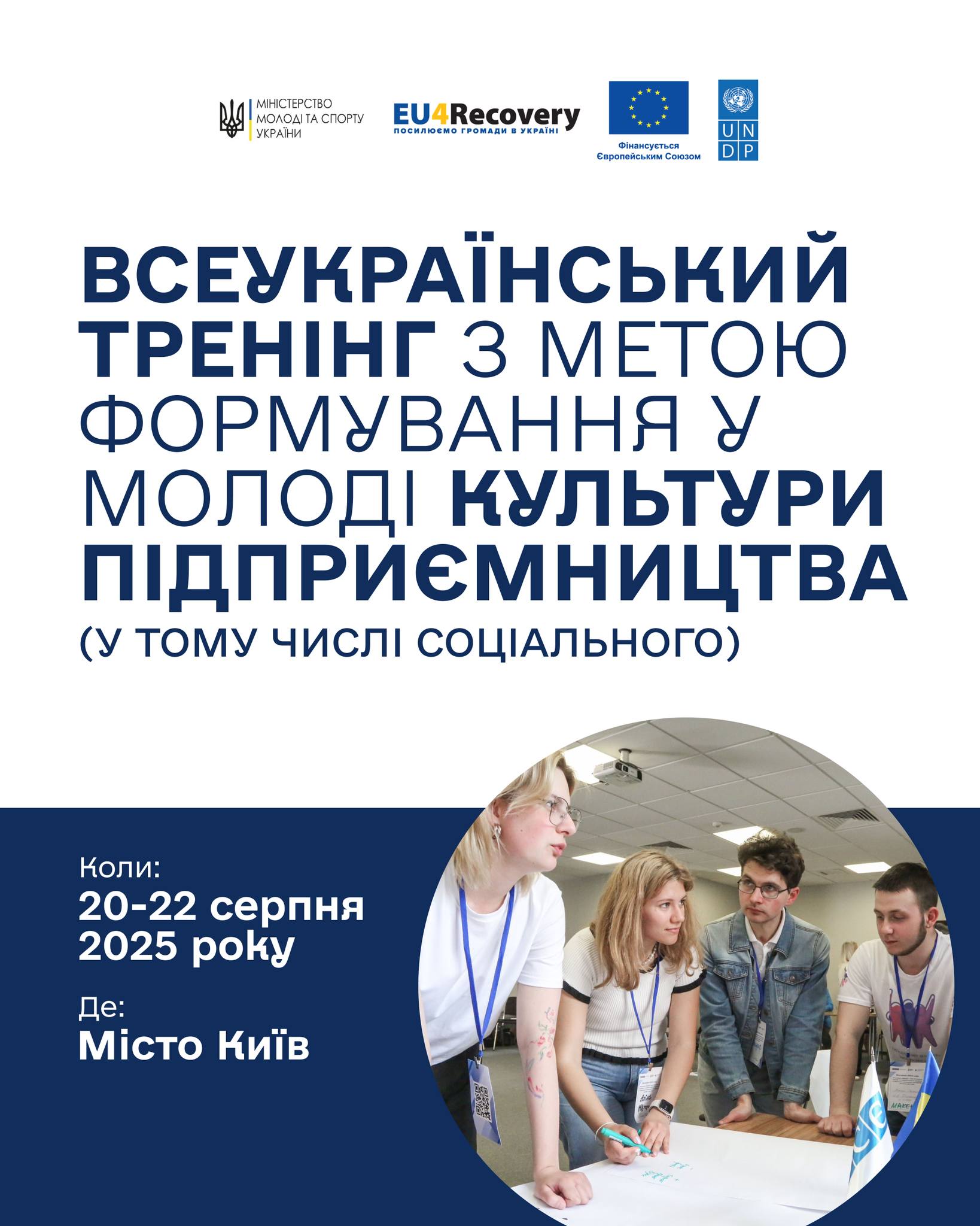 Запрошуємо до участі у Всеукраїнському семінарі-тренінгу, присвяченому розвитку культури підприємництва серед молоді. Захід відбудеться з 20 по 22 серпня 2025 року у м. Києві.