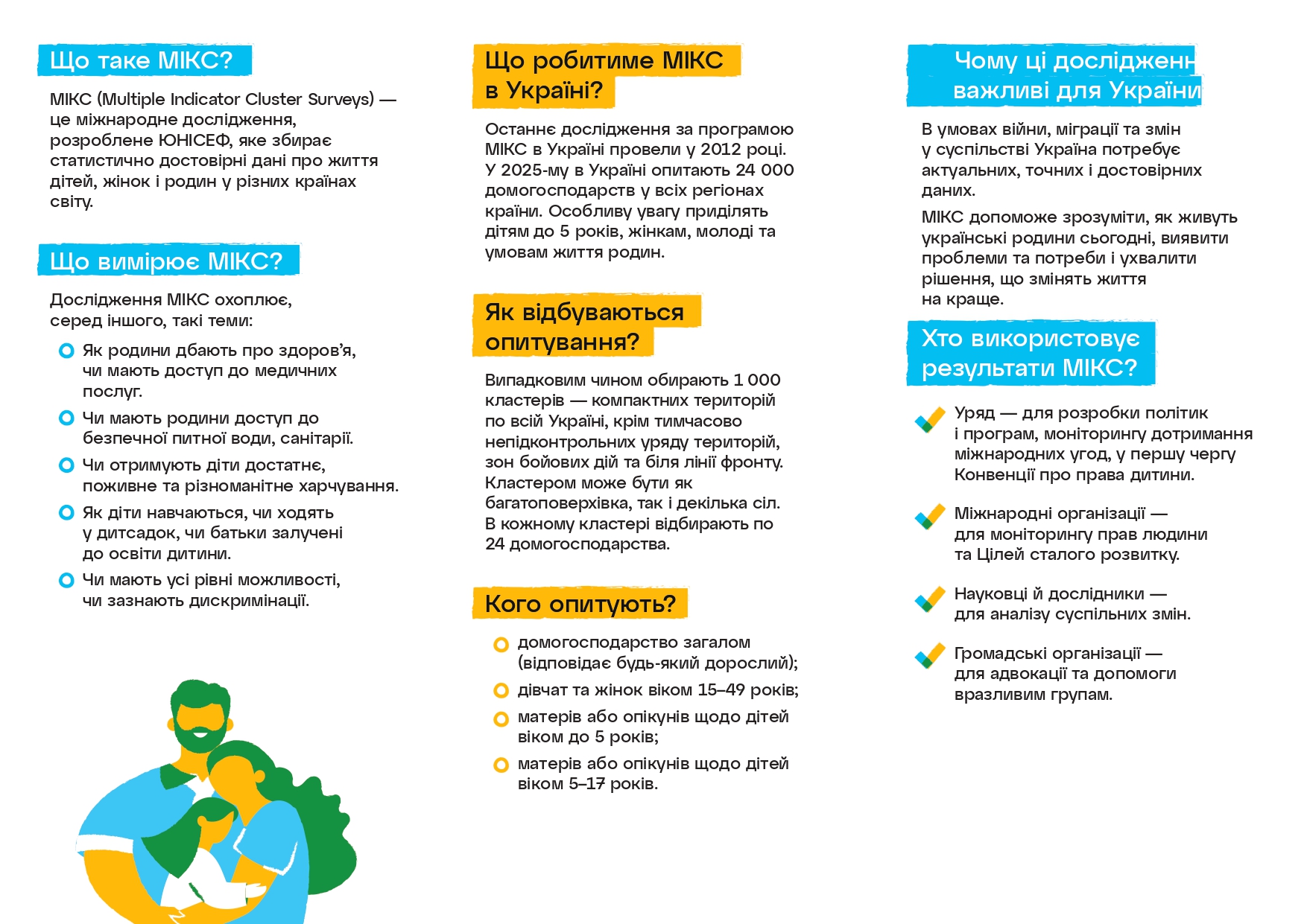 Детальнішу інформацію щодо МІКС можна отримати за телефоном гарячої лінії ЮНІСЕФ «Скажи як є»: 0 800 600 017 (безоплатно, працює щодня з 8:00 до 20:00) або за посиланням: https://www.unicef.org/ukraine/mics-survey.