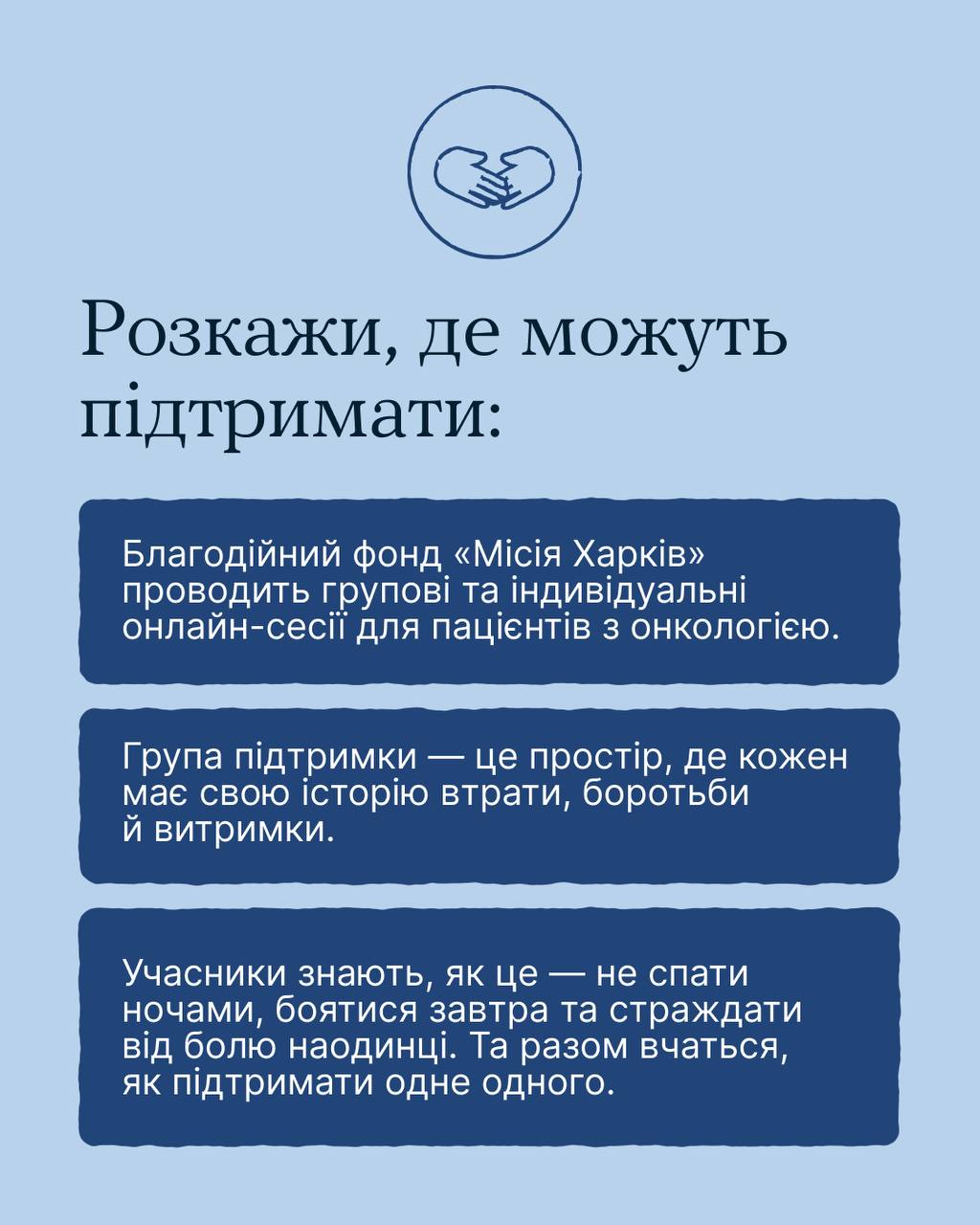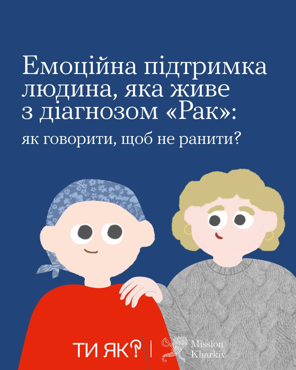 Спільно з БФ «Місія Харків» Всеукраїнська програма ментального здоров’я «Ти як?» підготувала рекомендації для тих, хто хоче бути поруч і підтримати близьку людину у боротьбі з онкологічним захворюванням: як діяти, що говорити, аби не завдати болю та бути справжньою опорою.