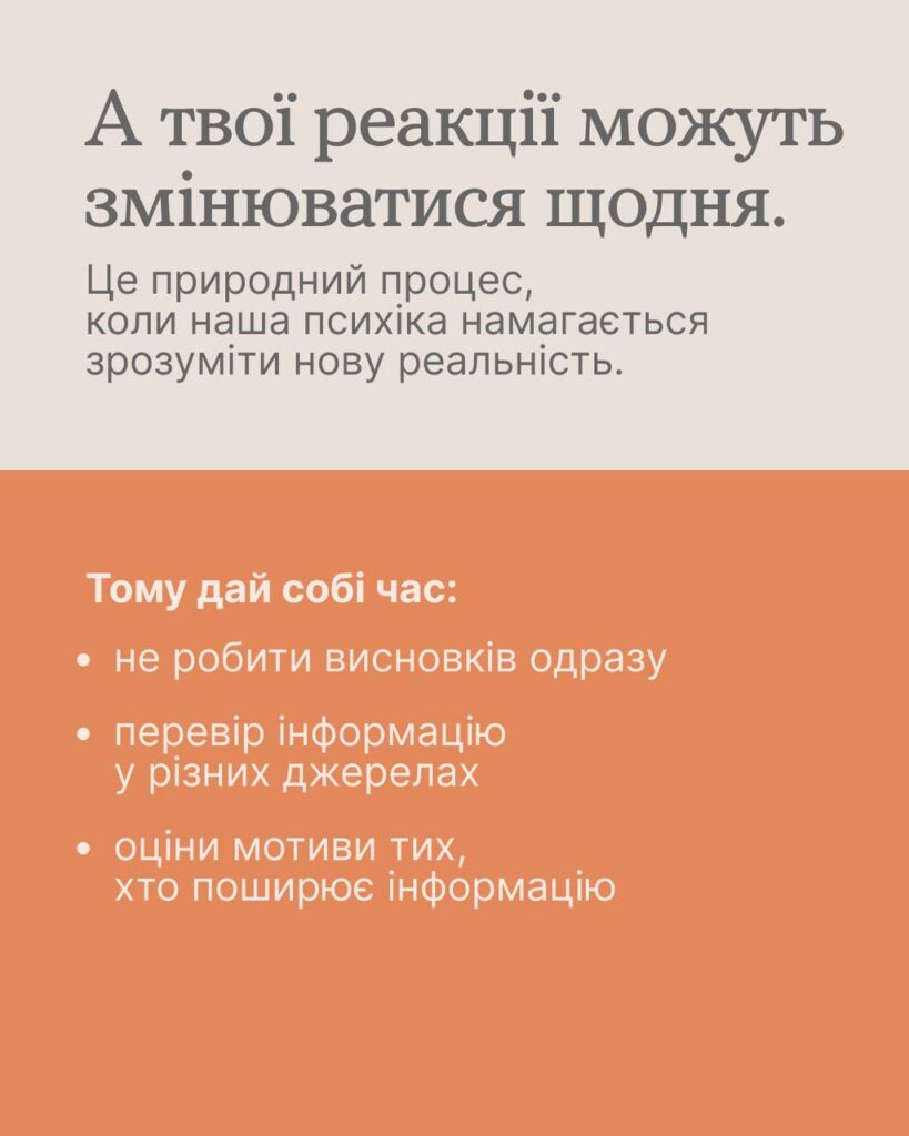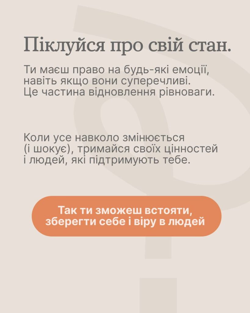 У такі моменти важливо не тиснути на себе. Дайте собі час усе відчути, осмислити, прожити. Не обов’язково одразу все розуміти чи вирішувати. Справжня опора – це не контроль над ситуацією, а довіра до себе, навіть у невизначеності.