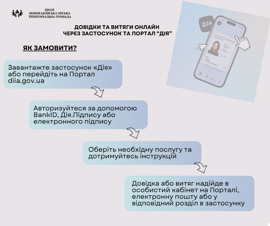 Центр надання адміністративних послуг інформує: для спрощення процедури отримання документів, мешканці громади можуть ознайомитися з переліком довідок та витягів, які доступні для швидкого онлайн-замовлення через мобільний застосунок та Портал «Дія».