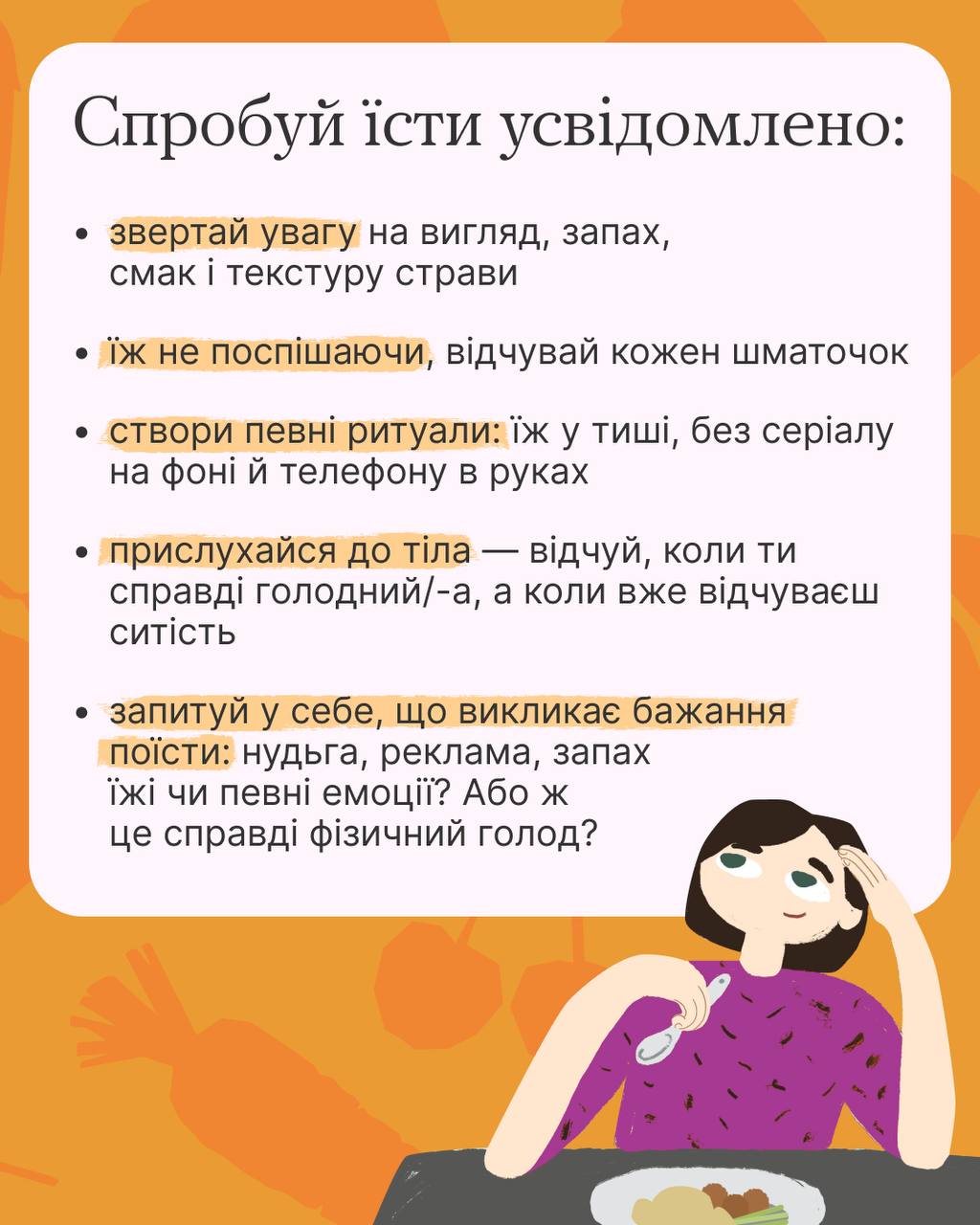 Будьте в моменті, слухайте своє тіло й насолоджуйтеся кожним шматочком усвідомлено – адже саме так можна відчути справжній смак життя.