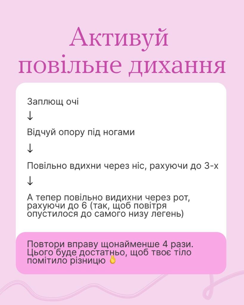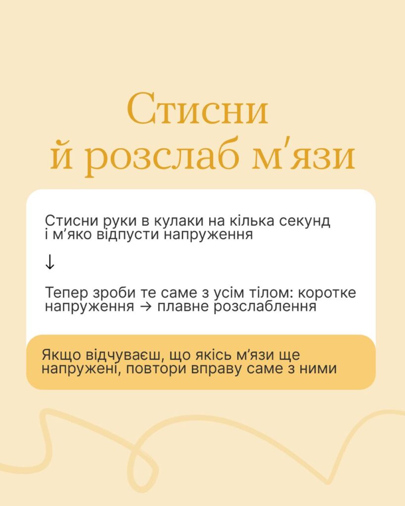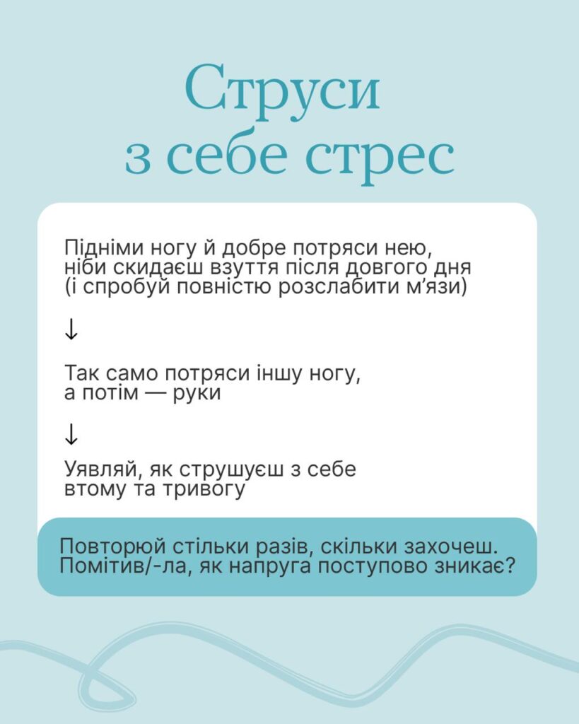 Щоб зменшити напругу, повернути відчуття опори та частково відновити ресурс, спробуйте три прості вправи, наведені далі. Вони допоможуть м’яко стабілізувати стан і підтримати себе у моменті.