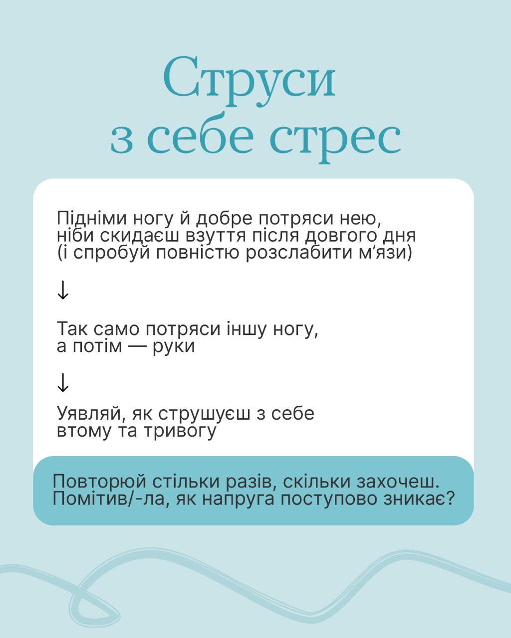 Щоб зменшити напругу, повернути відчуття опори та частково відновити ресурс, спробуйте три прості вправи, наведені далі. Вони допоможуть м’яко стабілізувати стан і підтримати себе у моменті.