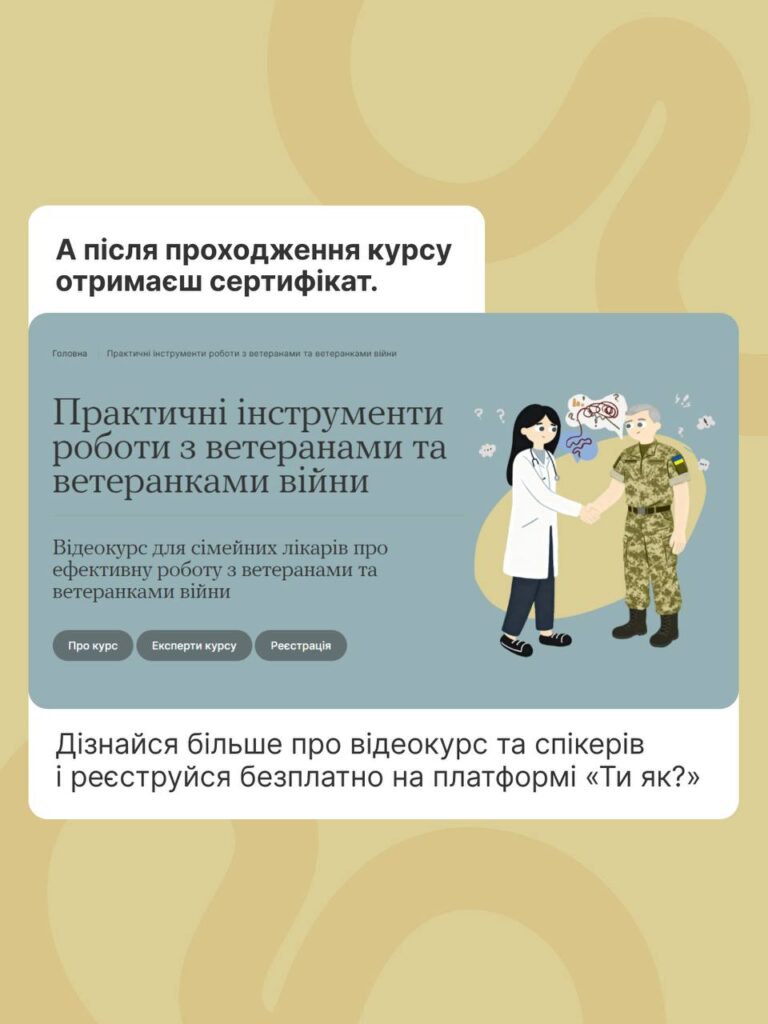 На платформі «Ти як?» доступний безоплатний навчальний курс, у межах якого розглядаються практичні інструменти побудови безпечного контакту, коректного обговорення складних тем і надання підтримки людям із бойовим досвідом з урахуванням їх психологічних потреб.
