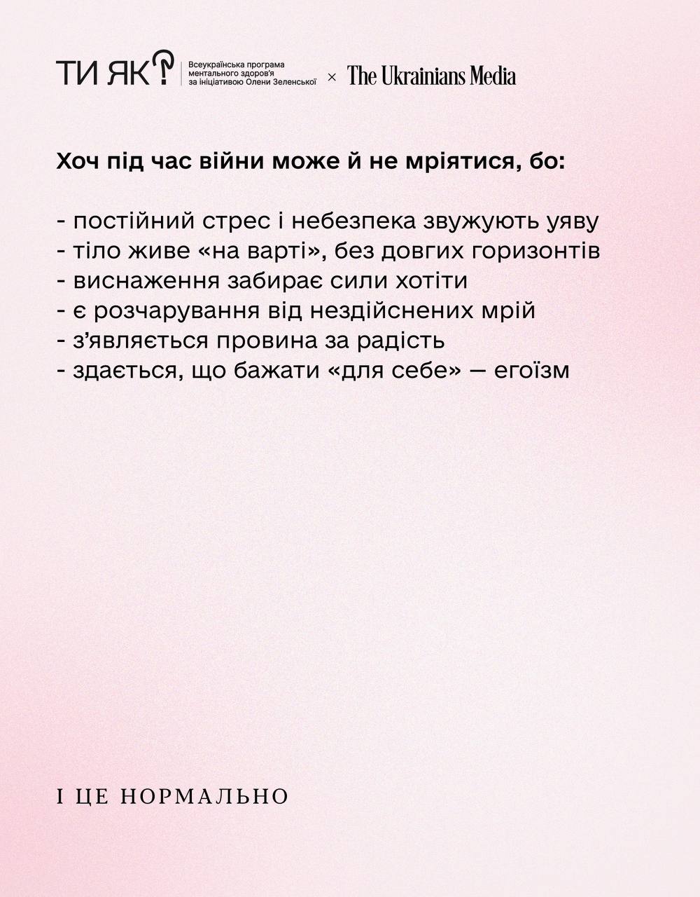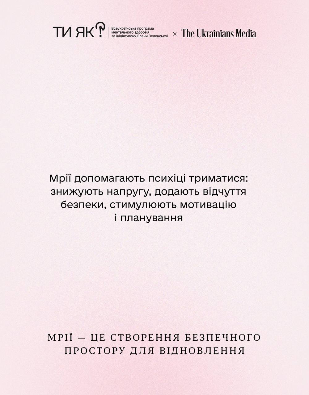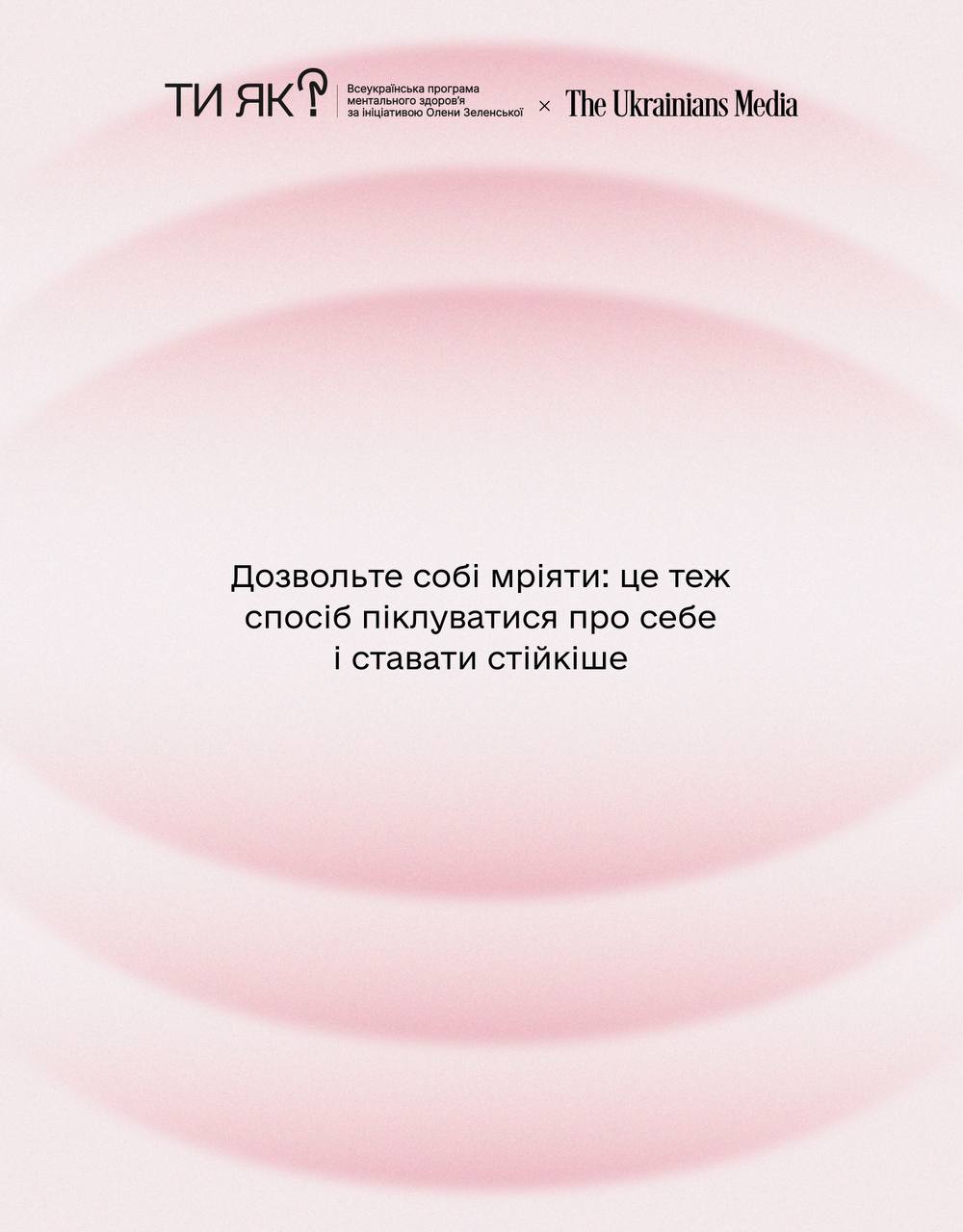Разом із The Ukrainians Media та психологинею Світланою Ройз Всеукраїнська програма ментального здоров’я «Ти як?» пропонує осмислити, чому мріяти сьогодні є важливою складовою психологічної стійкості та чому цілком природно, якщо вам іноді складно дозволити собі мріяти.
