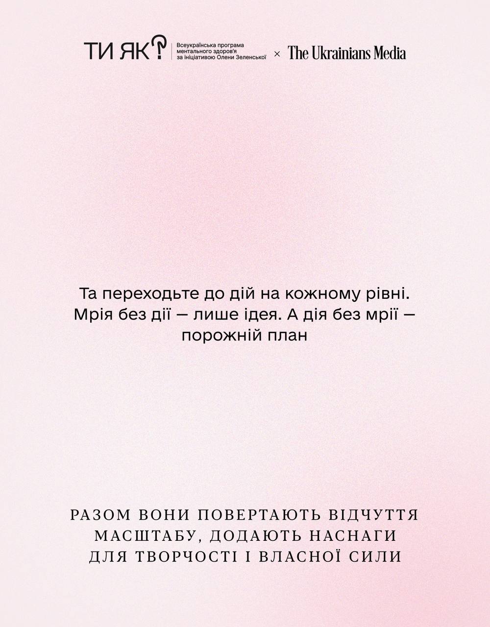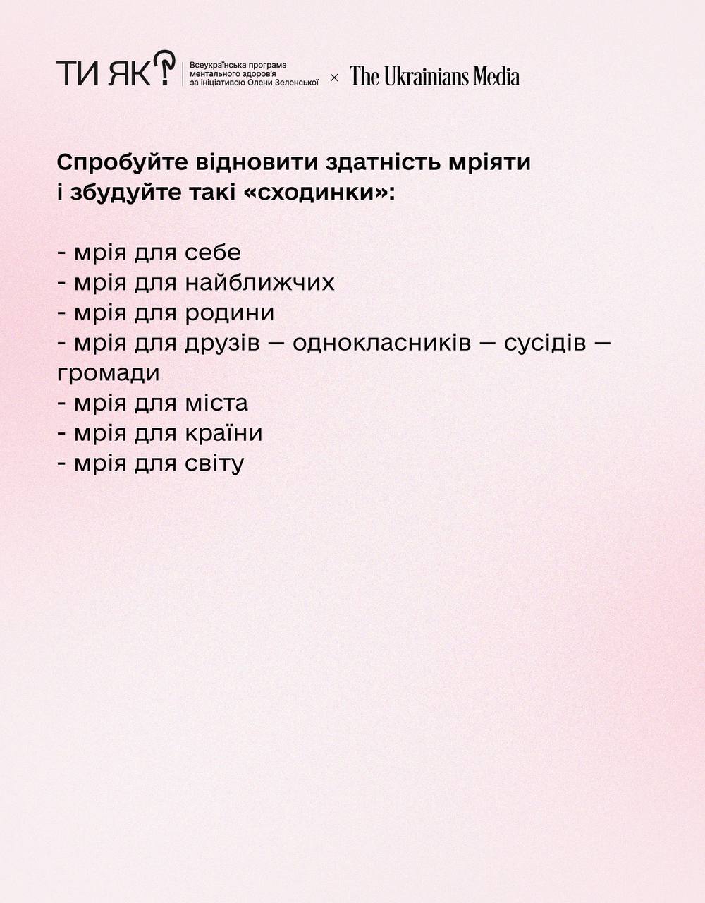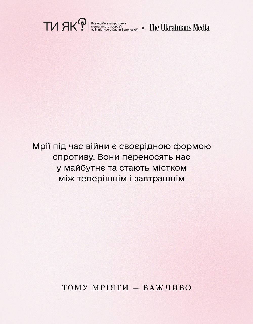 Разом із The Ukrainians Media та психологинею Світланою Ройз Всеукраїнська програма ментального здоров’я «Ти як?» пропонує осмислити, чому мріяти сьогодні є важливою складовою психологічної стійкості та чому цілком природно, якщо вам іноді складно дозволити собі мріяти.
