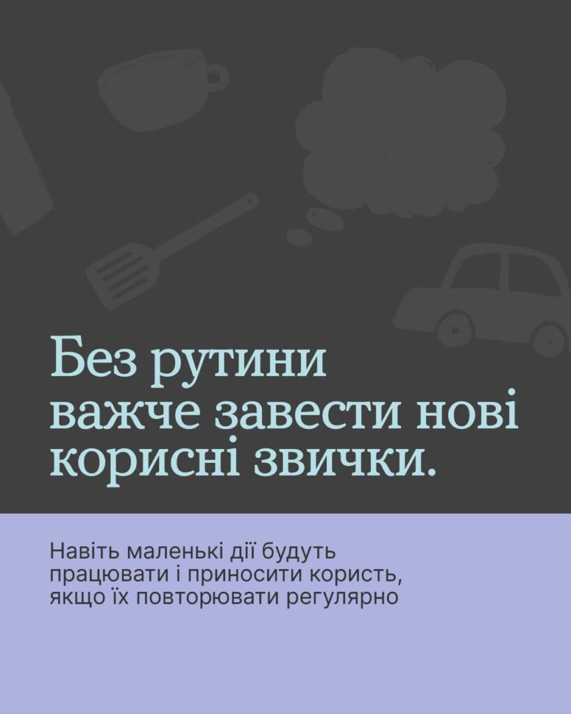Спробуйте визначити прості, щоденні дії, які можна повторювати систематично – це може бути планування завдань, фізична активність, ранкові або вечірні ритуали. Такі дії підтримують роботу мозку, допомагають ефективніше реагувати на стресові ситуації та підвищують концентрацію.