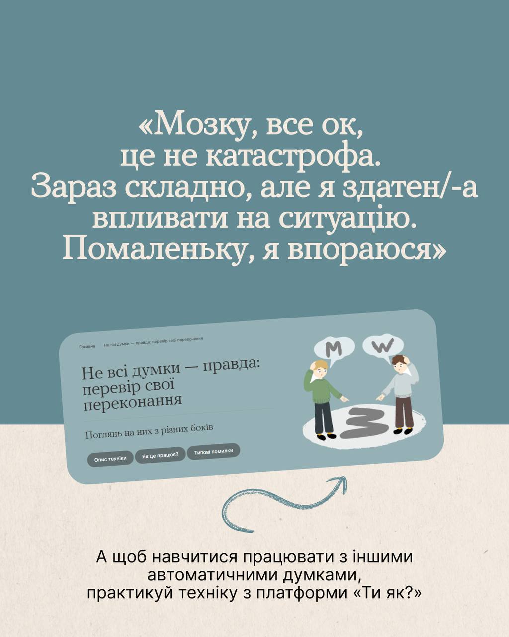 Запрошуємо ознайомитися з технікою «Не всі думки – правда», доступною на платформі «Ти як?» за посиланням: https://howareu.com/tekhnika_ne_vsi_dumky_pravda?utm_source=telegram&utm_medium=post&utm_campaign=product_sm.