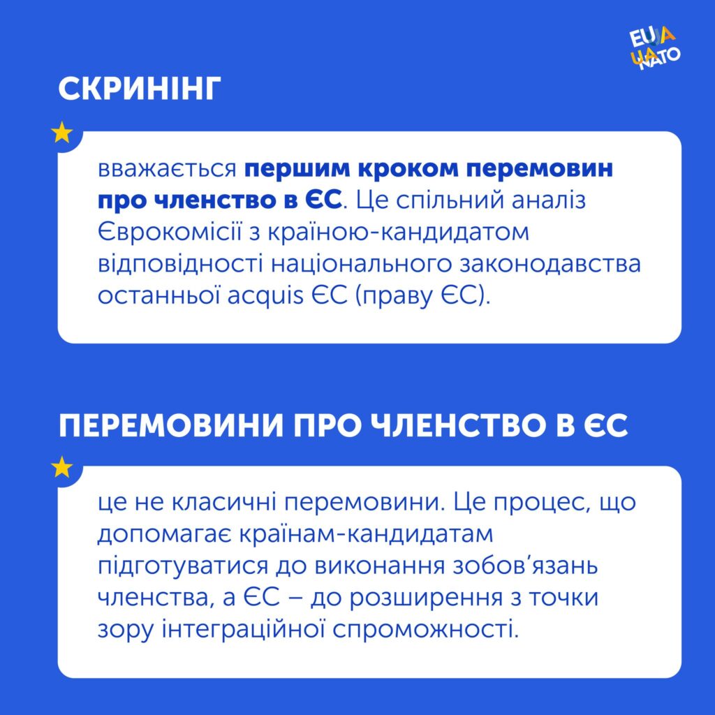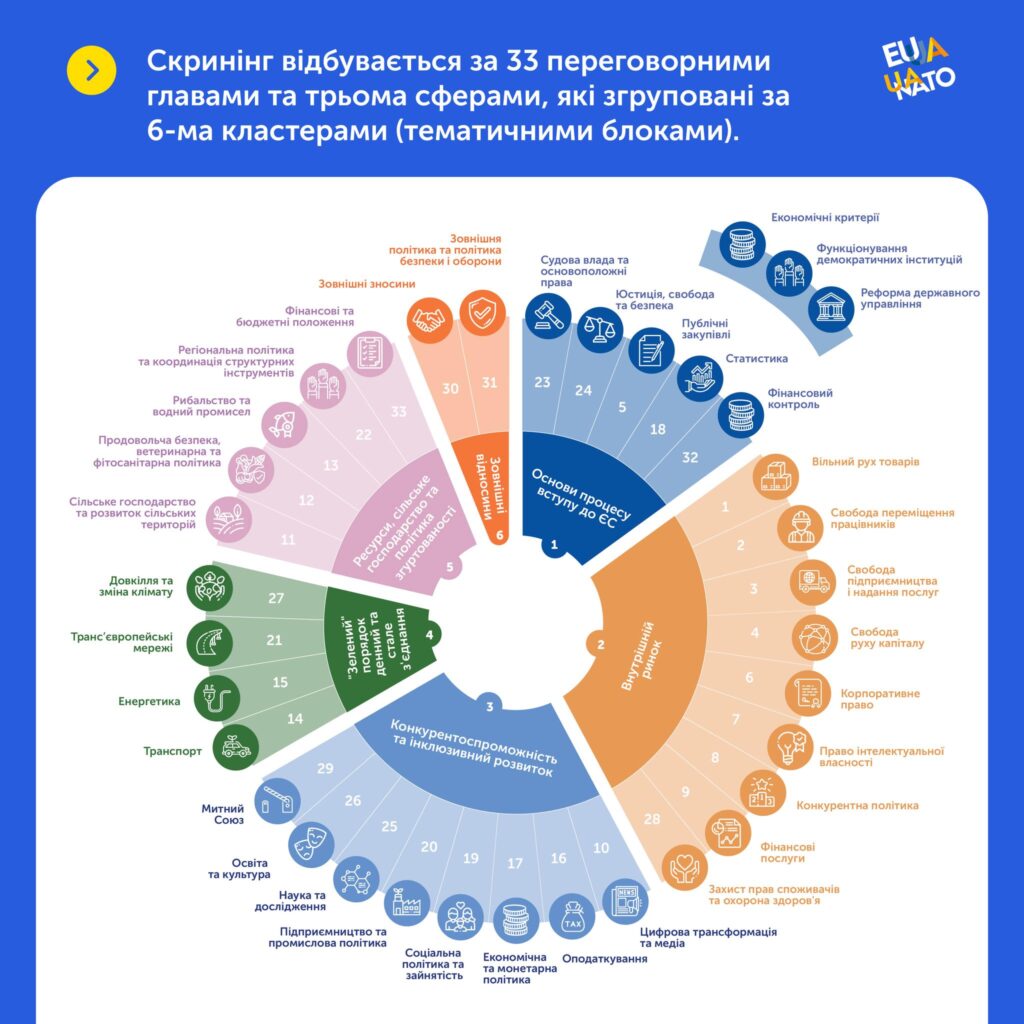 Офіс Віцепрем’єр-міністра з питань європейської та євроатлантичної інтеграції продовжує інформувати громадськість про шлях України до членства в Європейському Союзі, зокрема про один із ключових етапів переговорного процесу – процедуру скринінгу.