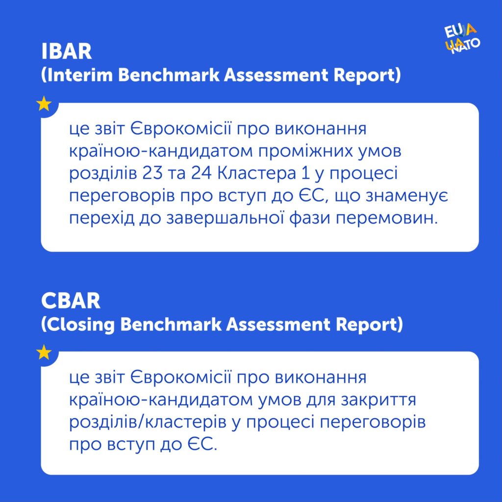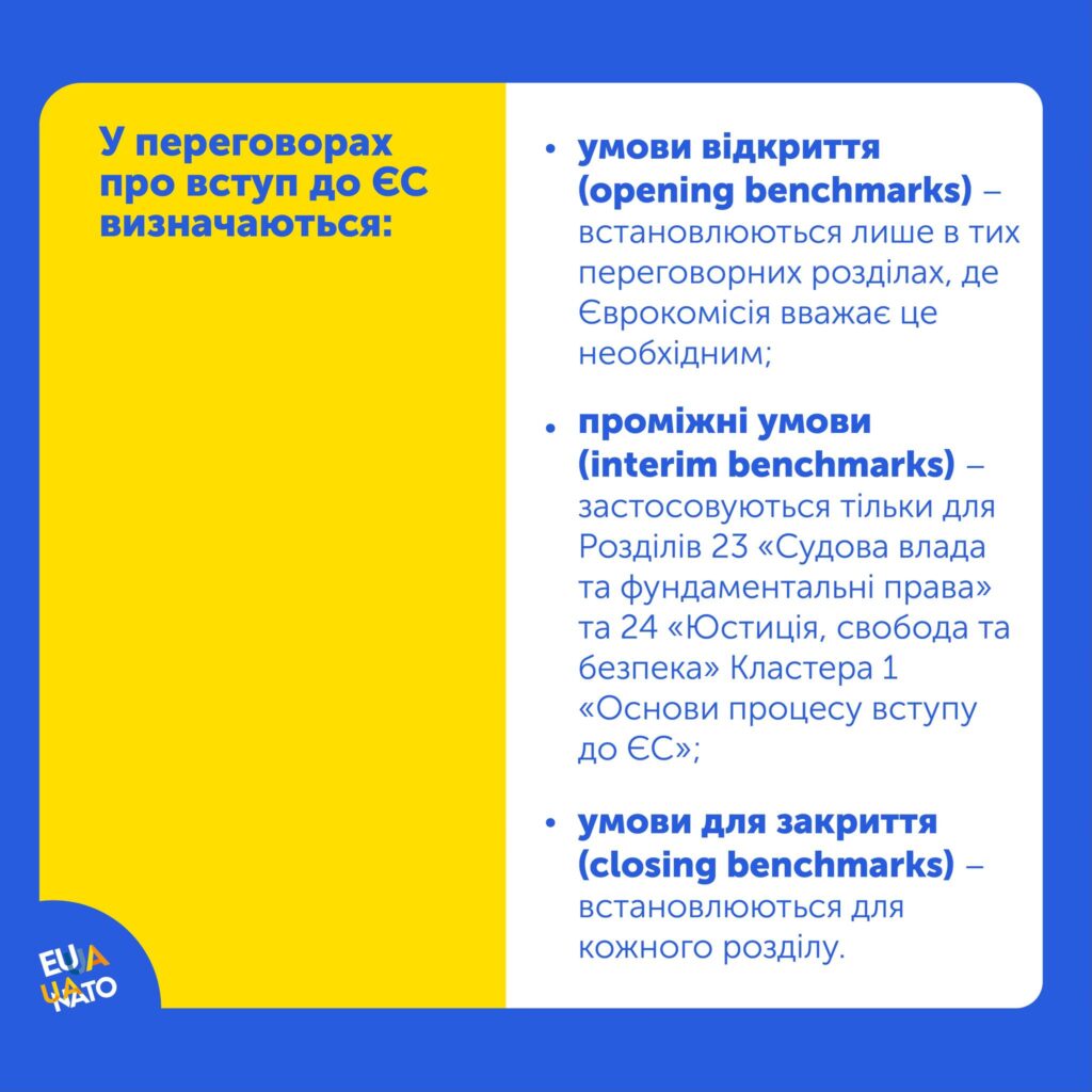 Продовжується інформування про ключові етапи переговорного процесу щодо вступу України до Європейського Союзу. Сьогоднішній матеріал присвячено умовам подальшого прогресу – так званим «бенчмаркам».