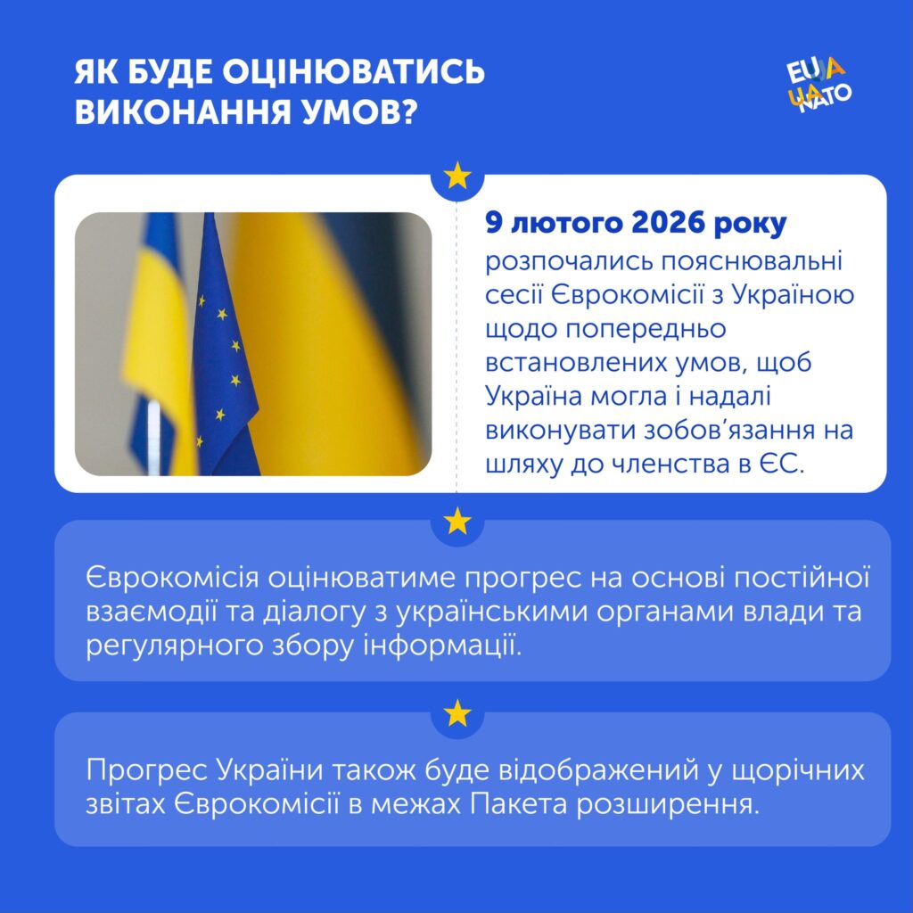 В інфографічному матеріалі детально розглядаються зазначені умови, їх значення та роль у процесі просування України до членства в Європейському Союзі.