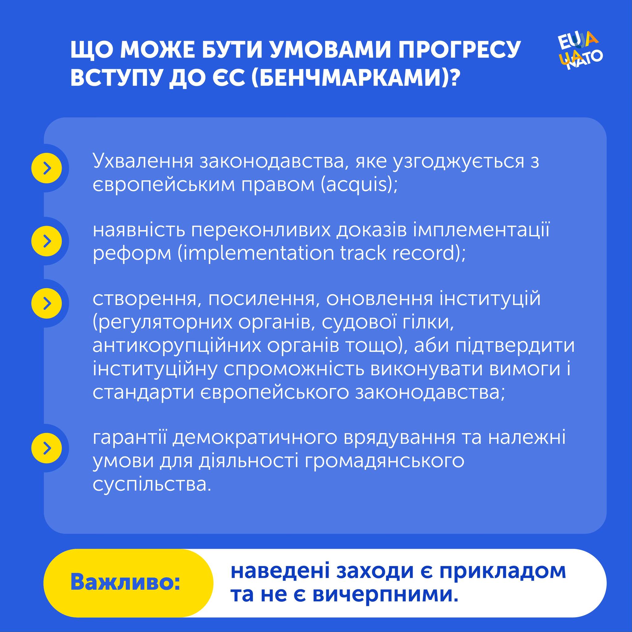 В інфографічному матеріалі детально розглядаються зазначені умови, їх значення та роль у процесі просування України до членства в Європейському Союзі.