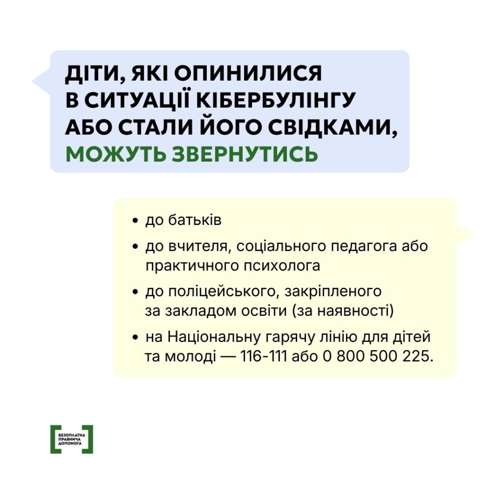 Інформацію про те, як розпізнати прояви кібербулінгу, які заходи необхідно вжити та куди звертатися для захисту прав дитини, викладено в ілюстративних матеріалах.