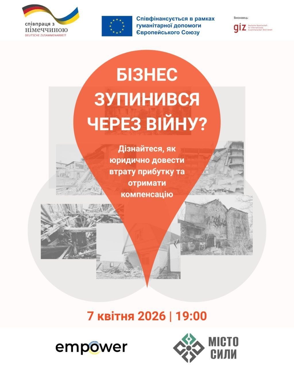 07 квітня 2026 року о 19:00 громадська організація «Місто Сили» запрошує на безоплатний вебінар на тему: «Компенсація за втрату прибутків як ФОП із-за збройної агресії».