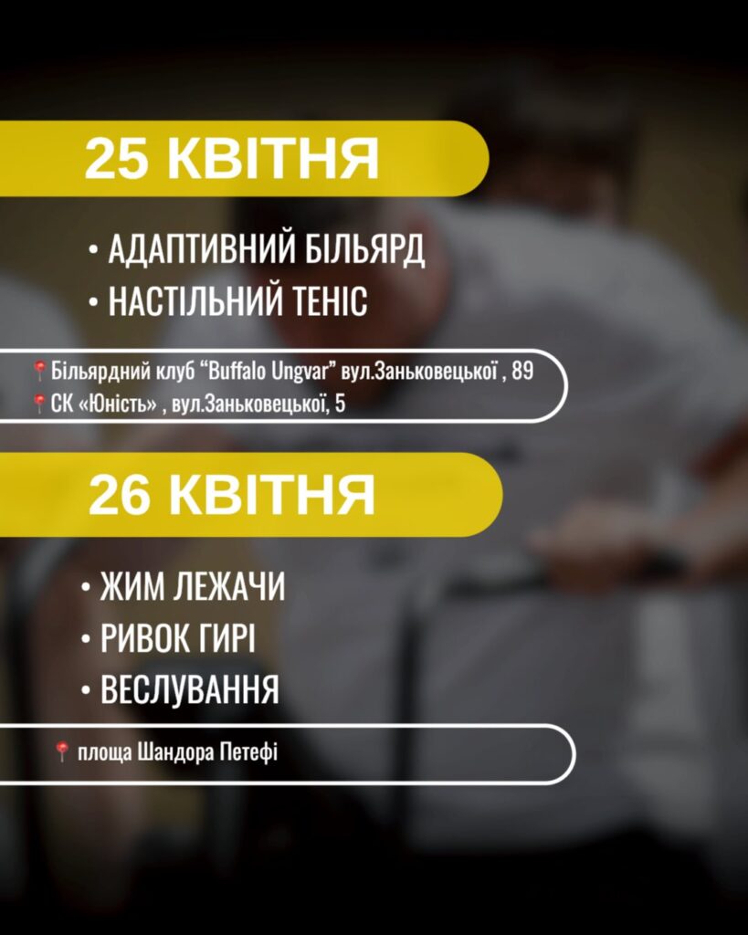 - 25 квітня – змагання з адаптивного більярду та настільного тенісу;