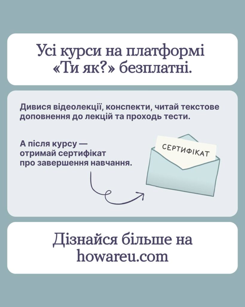 Дізнайтеся більше та реєструйтеся для проходження на освітній платформі «Ти як?» за посиланням: https://howareu.com/mainpage_course?utm_source=telegram&utm_medium=post&utm_campaign=courses.